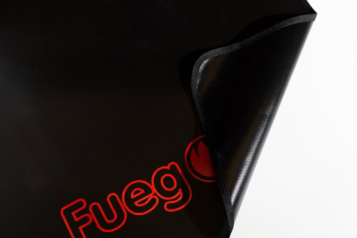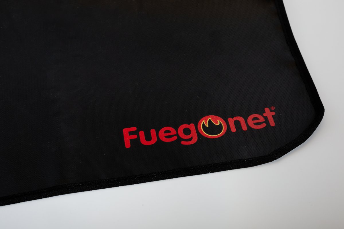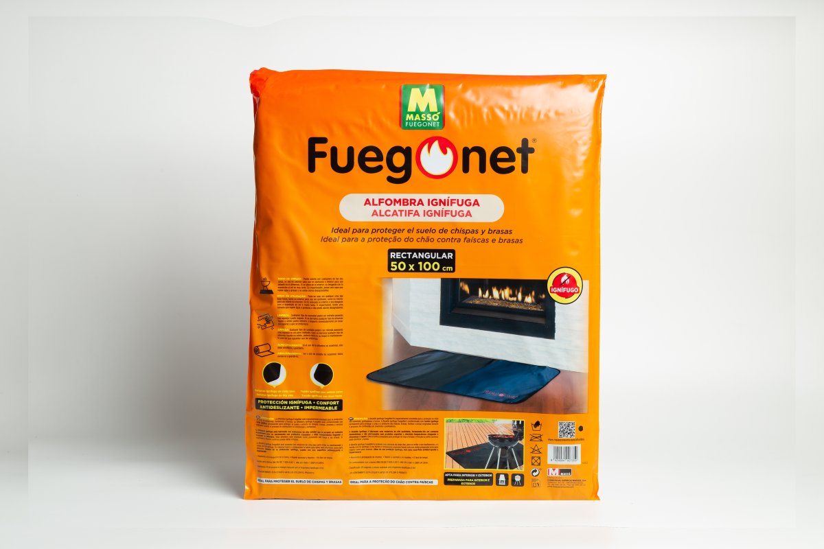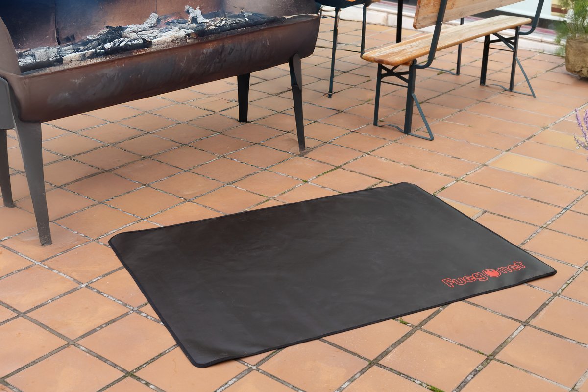 tejido ignífugo permanente para proteger el suelo y entorno de chispas, brasas, pavesas y cenizas originadas durante el proceso de combustión en chimeneas y barbacoas.