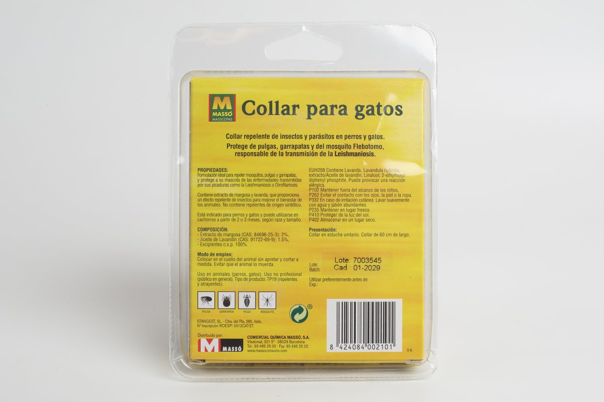 Modo de empleo: colocar en el cuello del animal sin apretar y cortar a medida. Evitar que el animal lo muerda.