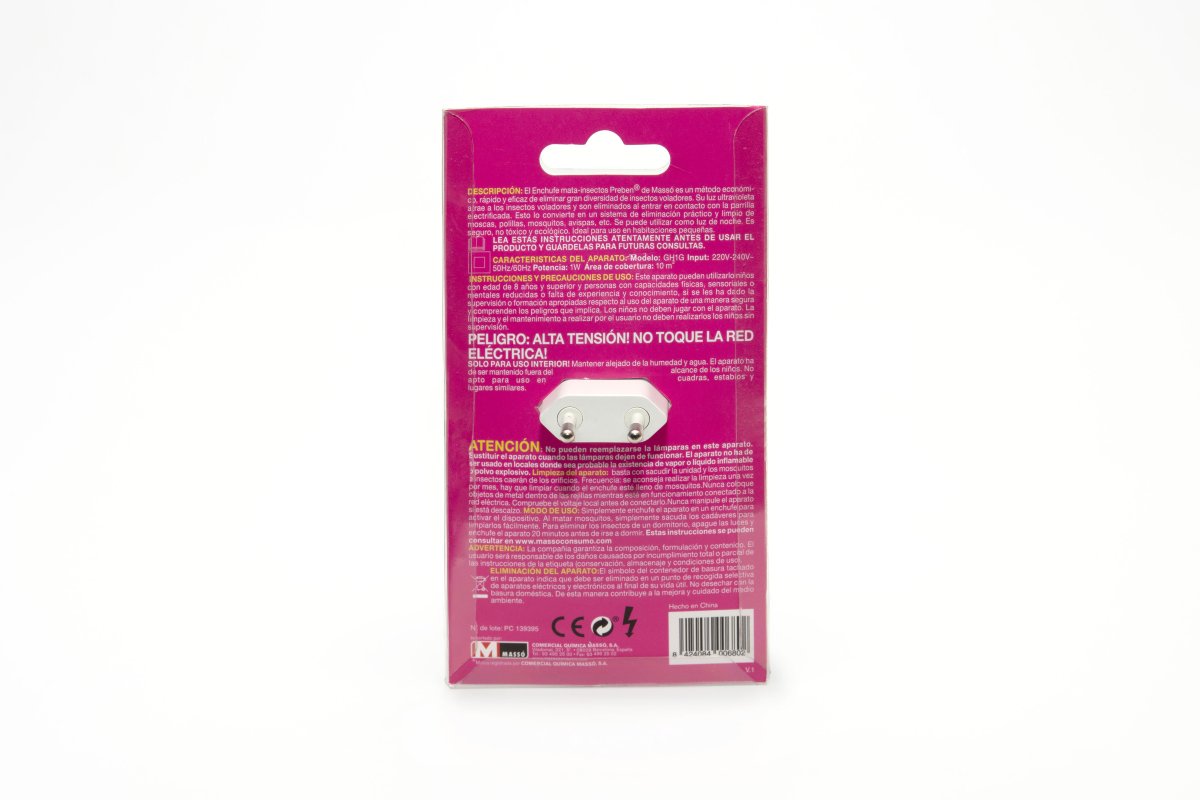 MODO DE USO: Simplemente enchufe el aparato en un enchufe para activar el dispositivo. Al matar mosquitos, simplemente sacuda los cadáveres para limpiarlos fácilmente. Para eliminar los insectos de un dormitorio, apague las luces y enchufe el aparato 20 minutos antes de irse a dormir.