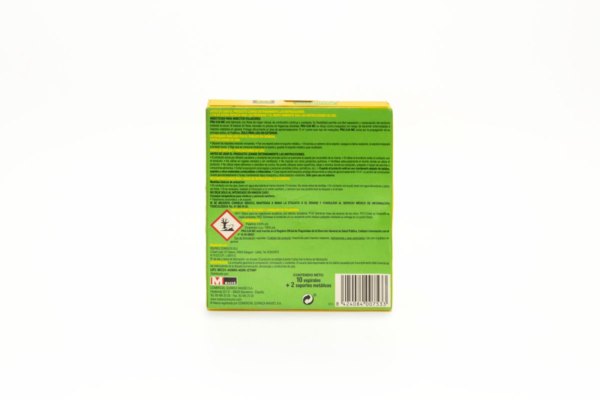 La espiral actúa mediante la propagación de praletrina, su principio activo, reduciendo eficazmente los vectores transmisores de enfermedades. Además, emite entre un 30 y 60% menos de monóxido de carbono y no contiene nitrato de potasio, lo que la convierte en una opción más segura para el medio ambiente.
