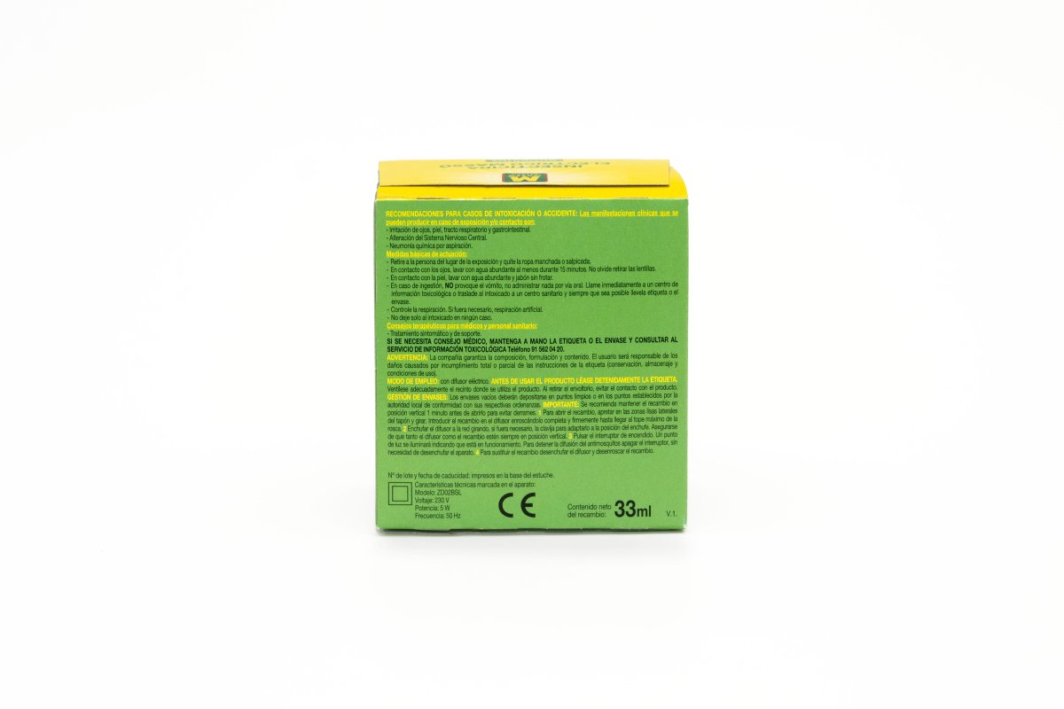 El aparato Insecticida Eléctrico Preben de Massó debe ser utilizado únicamente con el Recambio Preben de Massó. El uso de otro recambio o sustancia puede dar lugar a riesgos de toxicidad o de incendio. No utilices el aparato sin recambio. No toques el aparato con las manos húmedas ni con objetos metálicos. No expongas el aparato a la luz del sol directa. Coloca el aparato siempre en posición vertical sin cubrir el aparato con tejidos ni otros materiales. No utilices productos de limpieza ni disolventes para limpiar el aparato. Límpialo con un paño húmedo y déjalo secar.