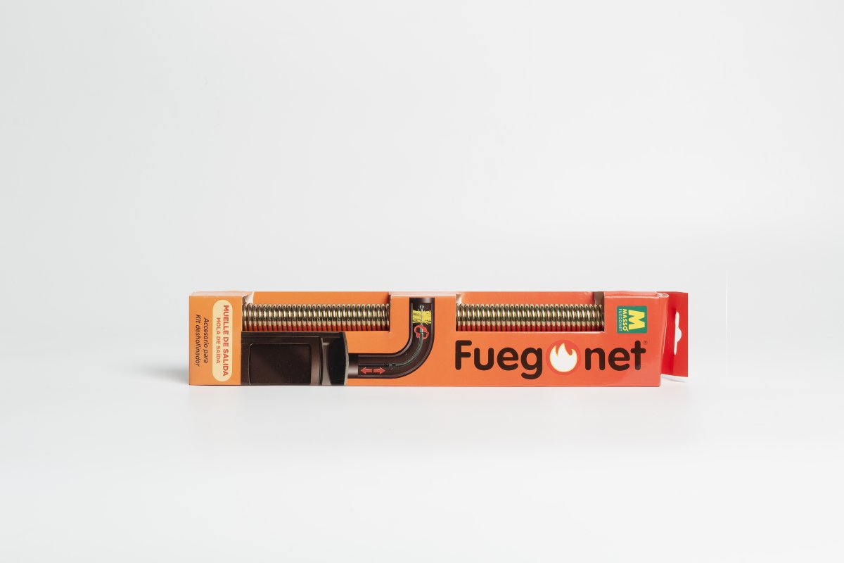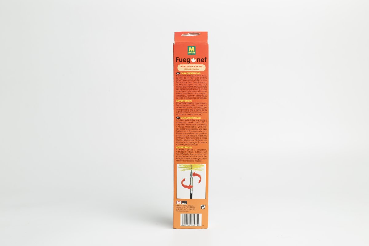 El muelle de salida para deshollinadores es el accesorio indispensable para limpiar chimeneas con codos de 45º y 90º de forma más cómoda y efectiva. Diseñado para colocarse entre la varilla y el erizo de los kits de limpieza, este muelle aumenta la torsión y flexibilidad del conjunto, permitiendo que el erizo pase sin dificultad por curvas y zonas de difícil acceso en los conductos.