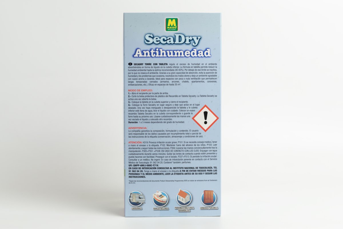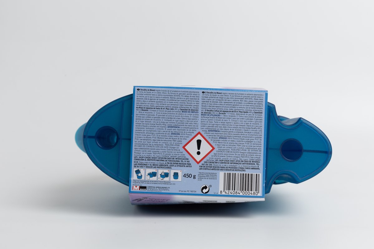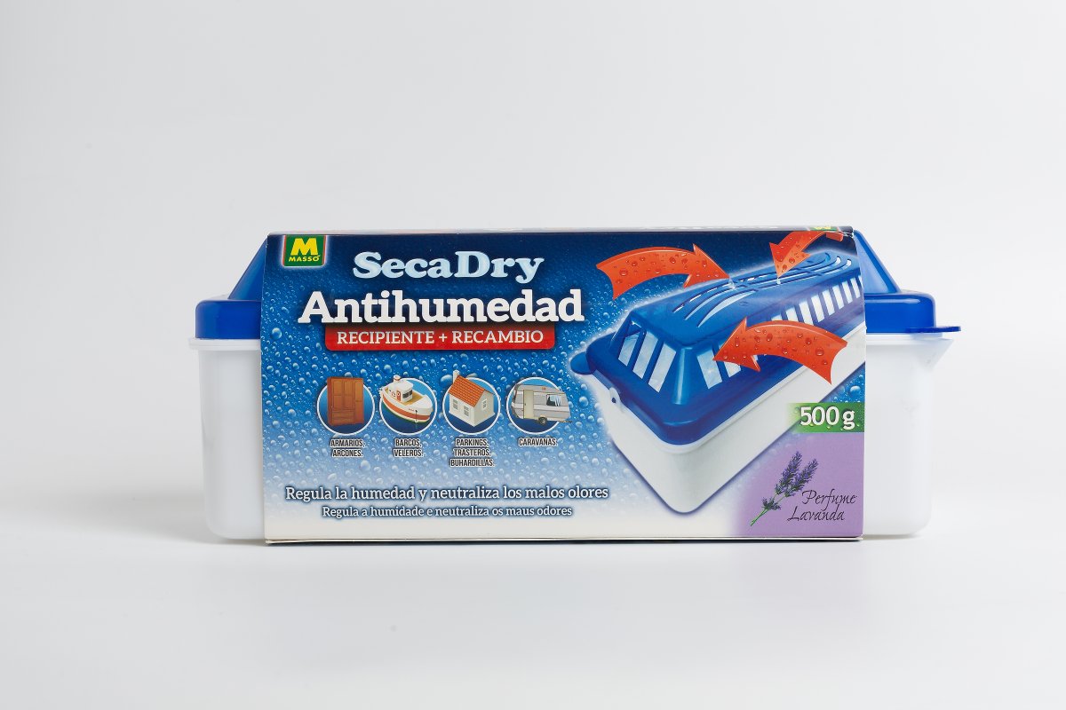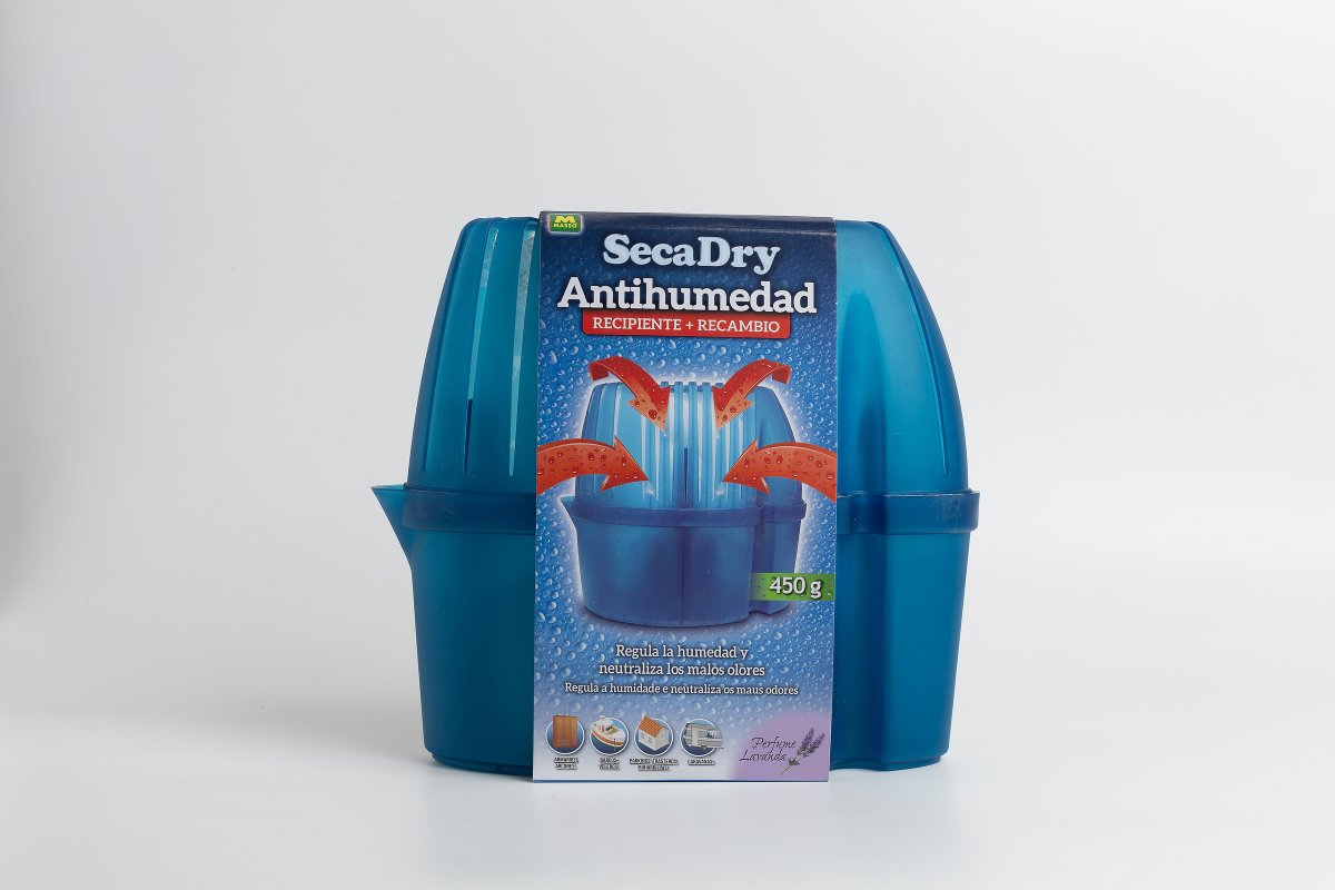 El producto incluye un recipiente y un recambio de granulado que dura entre 1 y 3 meses, dependiendo del nivel de humedad en el ambiente. Su uso es muy sencillo: basta con colocar la bolsa en la bandeja de la base y cerrar la tapa superior. Una vez el granulado se haya consumido, solo hay que reemplazarlo con una nueva recarga SecaDry.
