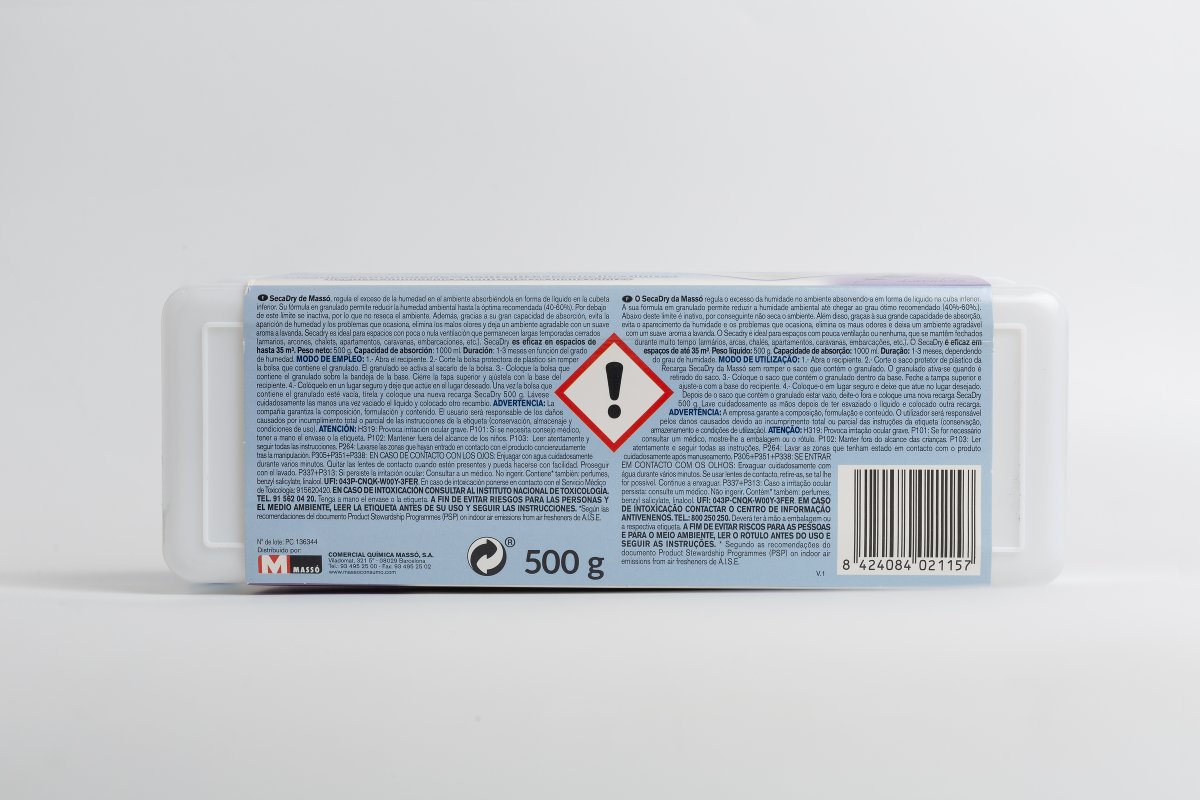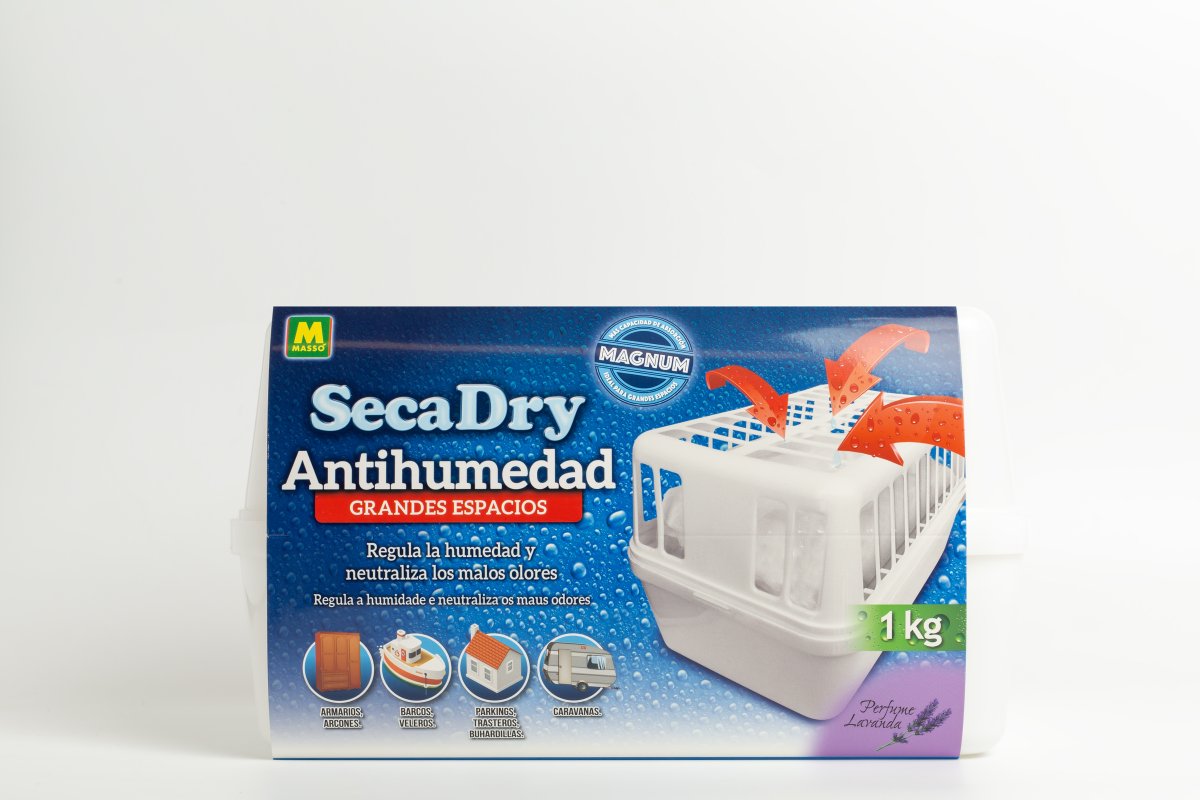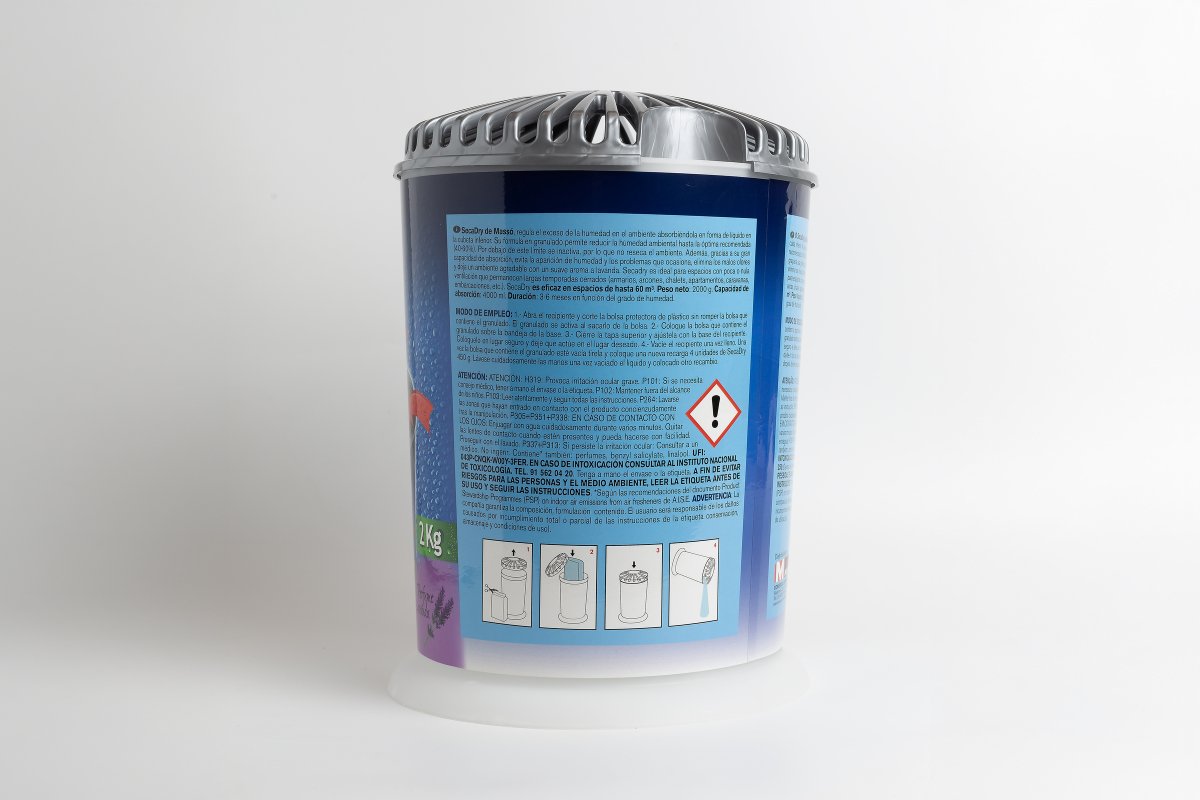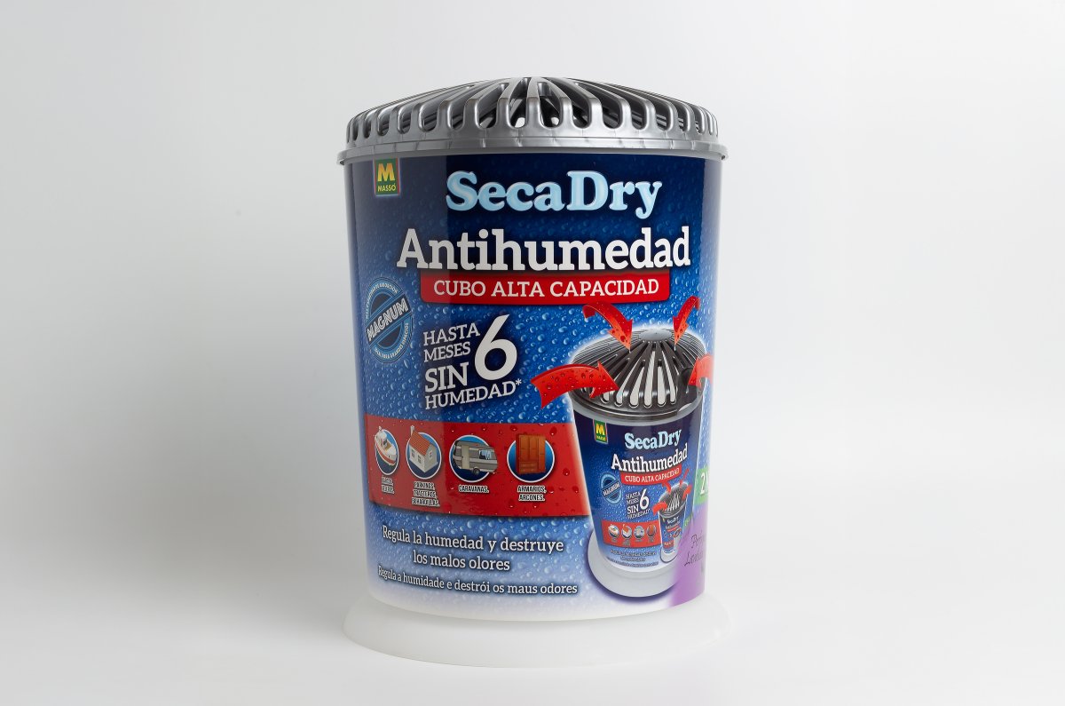 El producto incluye un recipiente y un recambio de granulado que dura entre 1 y 3 meses, dependiendo del nivel de humedad en el ambiente. Su uso es muy sencillo: basta con colocar la bolsa en la bandeja de la base y cerrar la tapa superior. Una vez el granulado se haya consumido, solo hay que reemplazarlo con una nueva recarga SecaDry.