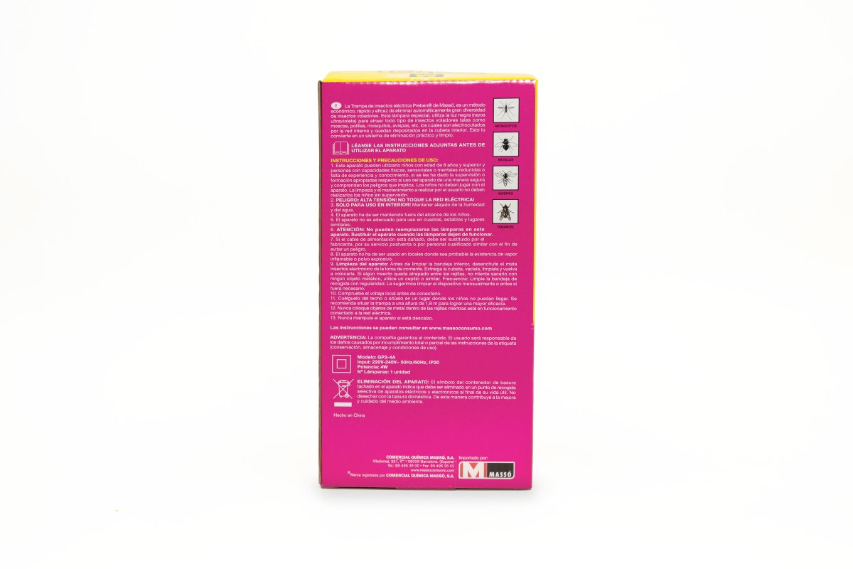 La trampa de insectos eléctrica de Preben es una solución eficaz para eliminar una amplia variedad de insectos voladores, incluyendo moscas, mosquitos, avispas, polillas y tábanos. Utiliza una lámpara especial con luz negra (rayos ultravioleta) para atraer a los insectos, que son electrocutados al entrar en contacto con la red interna de baja tensión. Los insectos caen en una cubeta interior, lo que permite una eliminación limpia y práctica.
